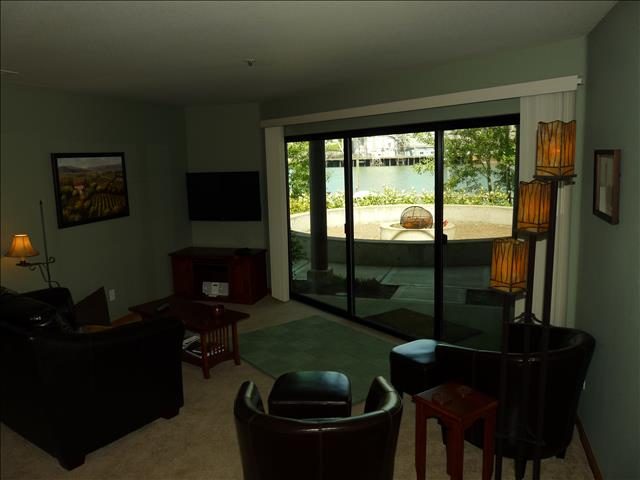 You'll enjoy views of the water from the living room and bedroom, and appreciate direct access to the patio, fire pit and barbecue